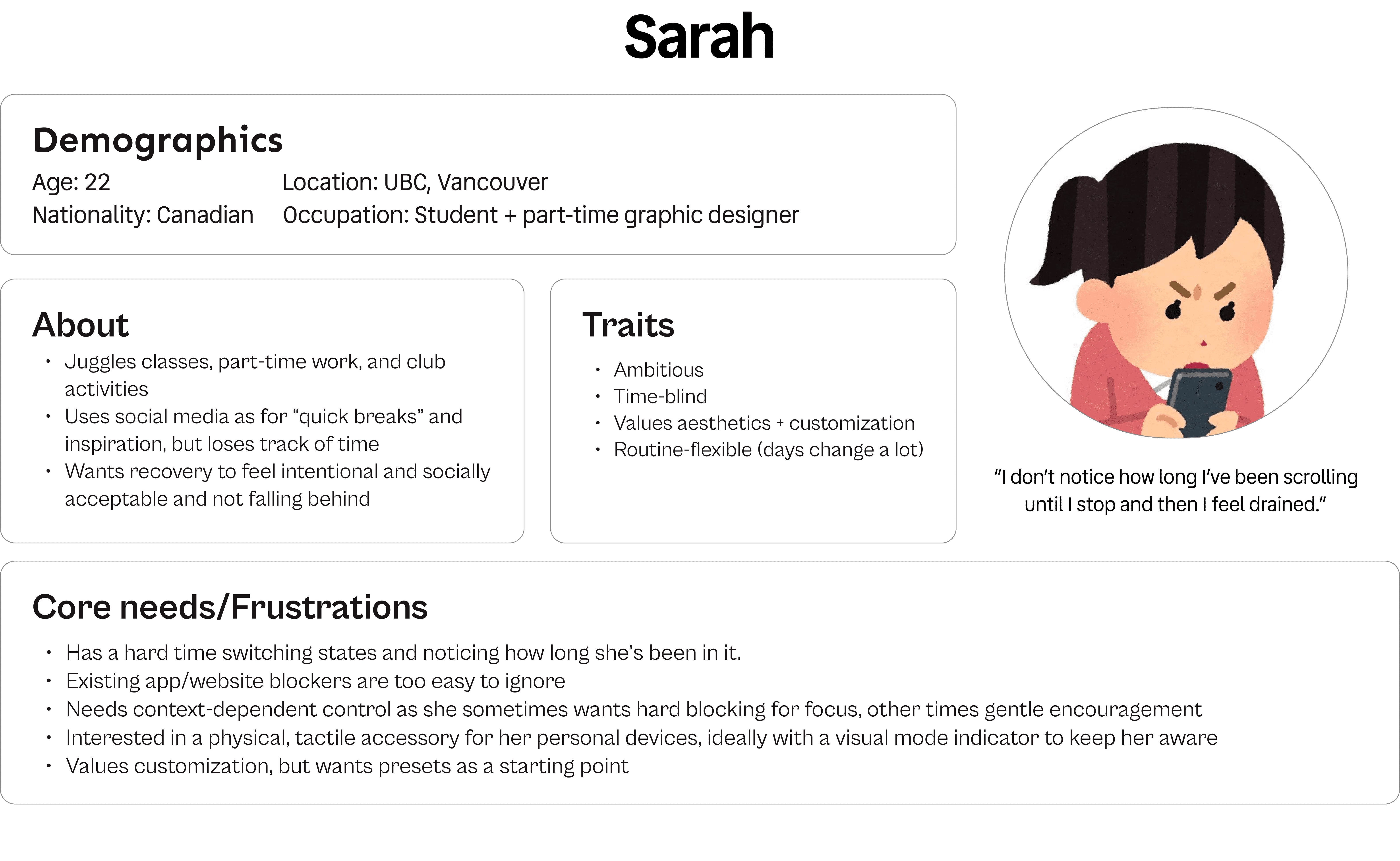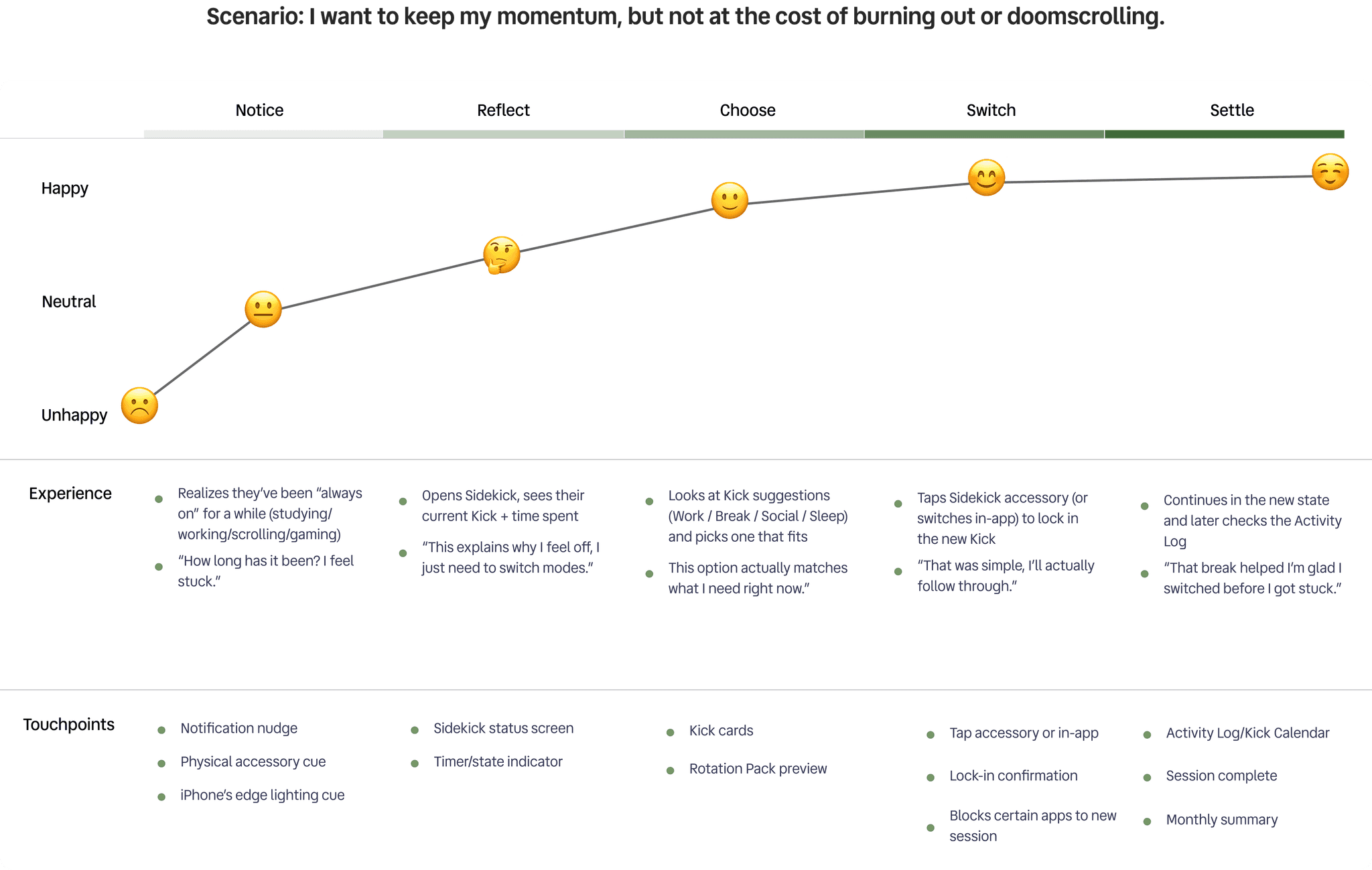 To better understand our user’s experience, we created a user journey map to capture what happens before, during, and after someone gets stuck in an “always on” state. The biggest breakdown we identified was time blindness as users often don’t realize how long they’ve been in one mode until they already feel drained. Sidekick is designed around a gentle loop: notice → reflect → choose → switch → settle.
