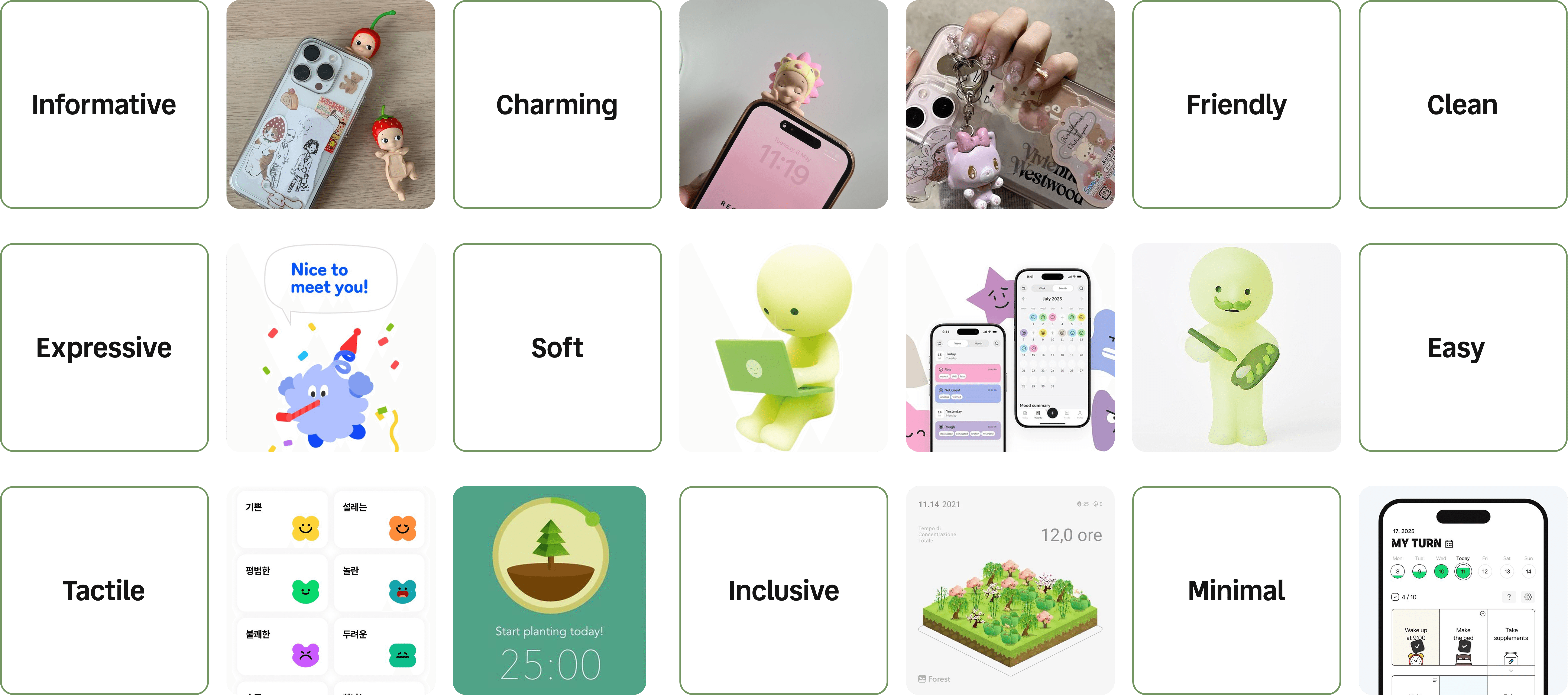 Soft, neutral colours with gentle accents to feel calming instead of “productivity pressure”