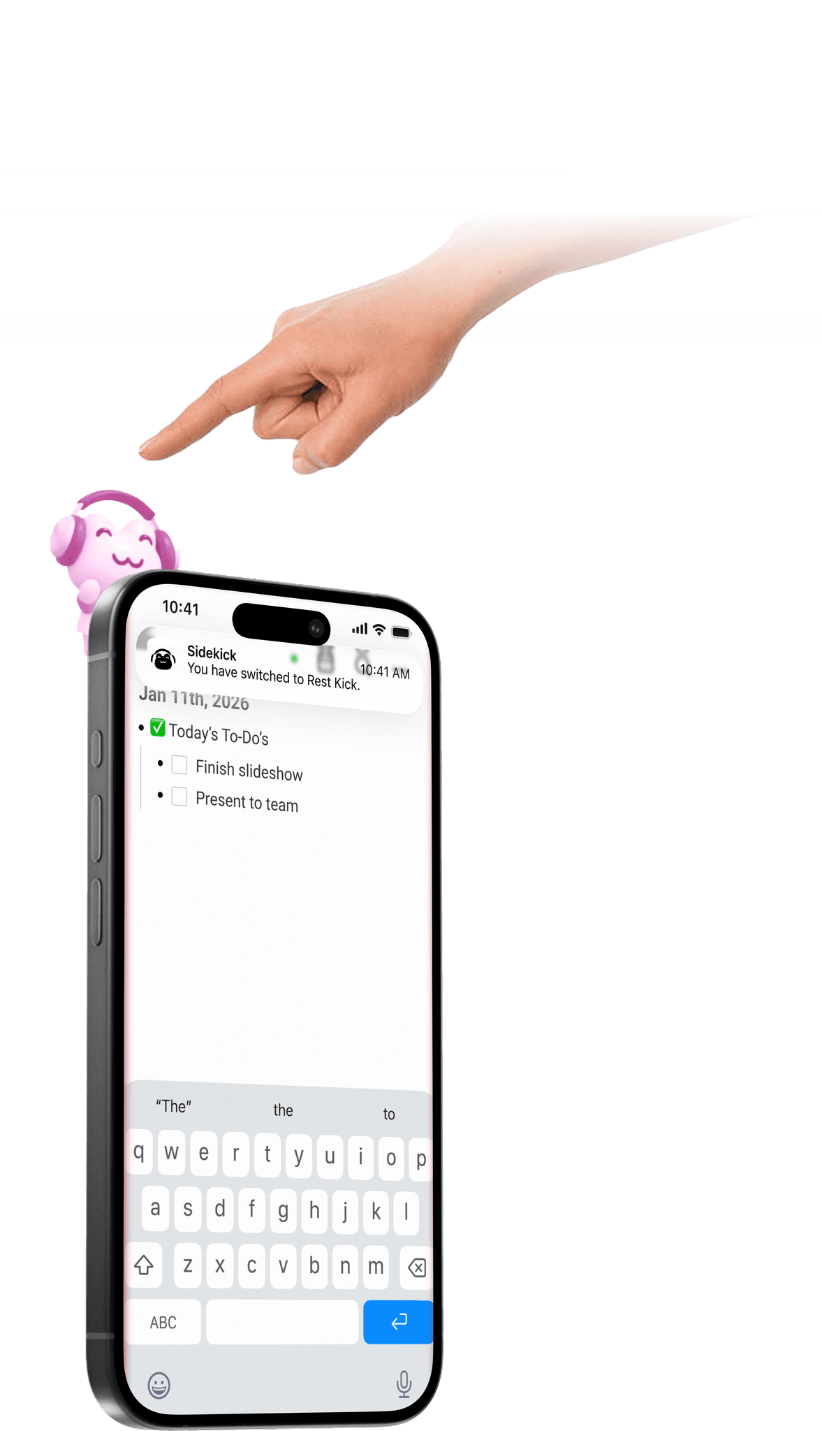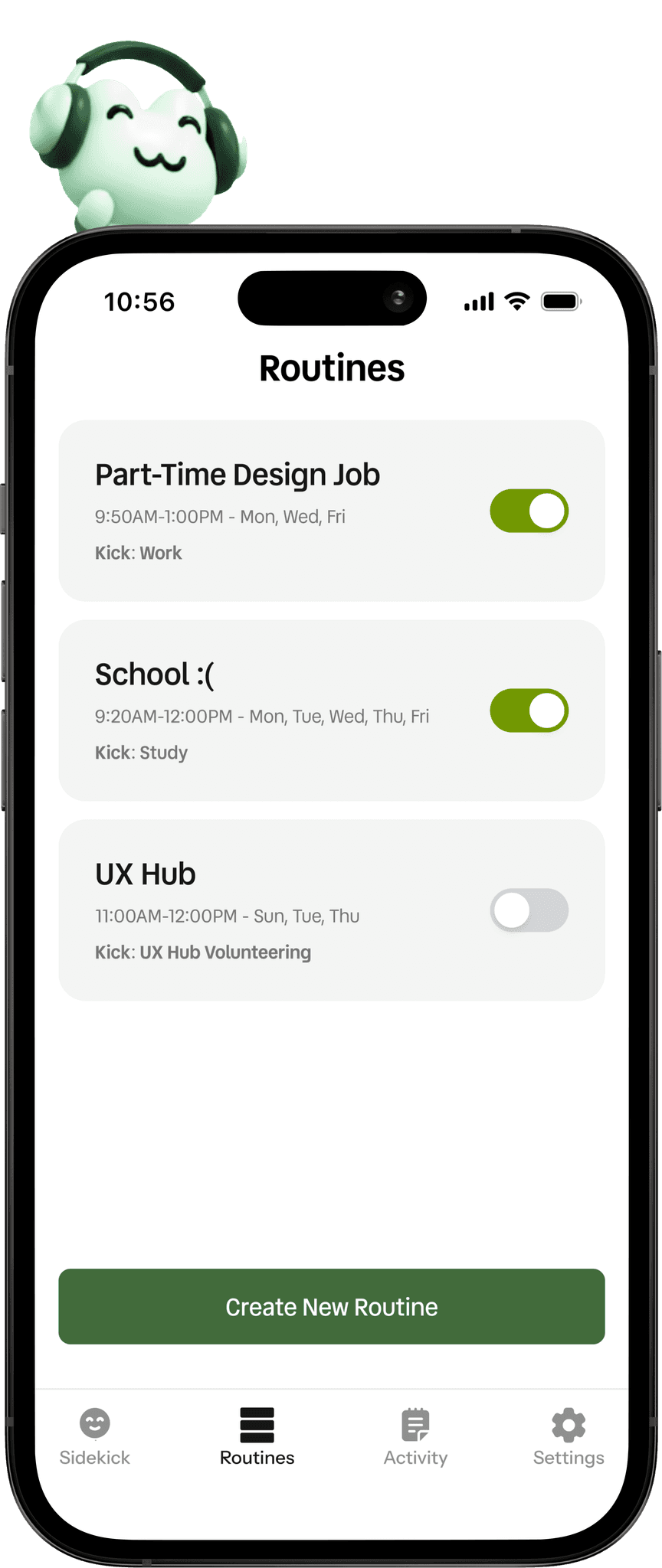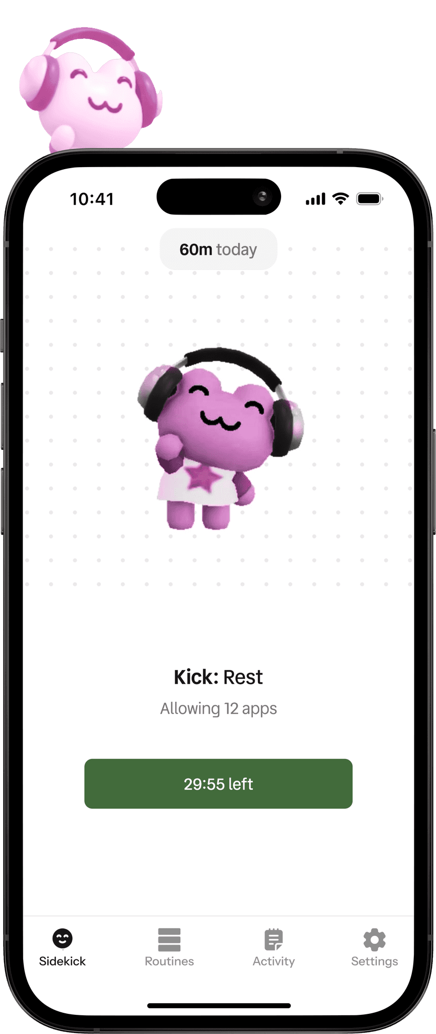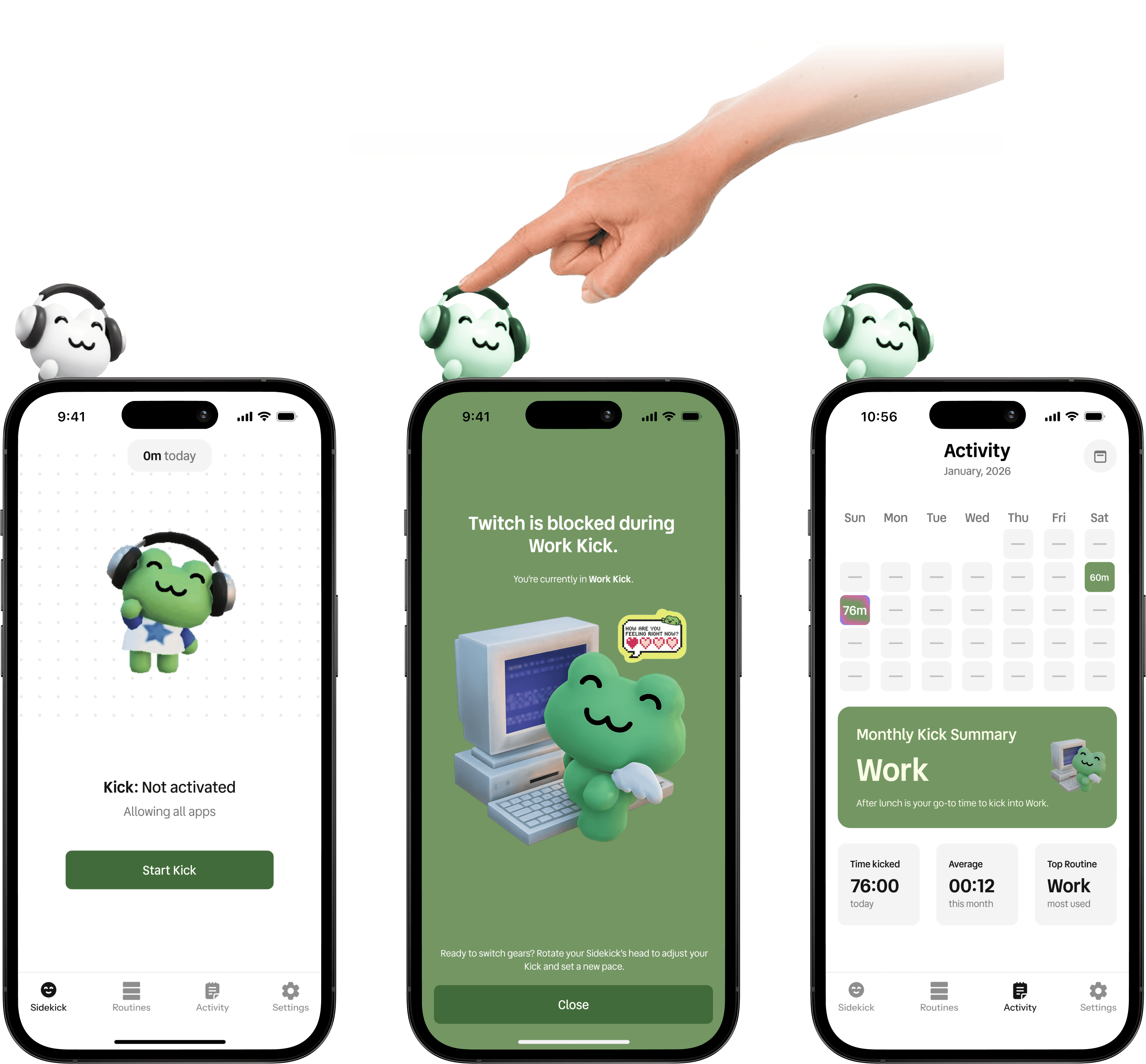Sidekick is a NFC phone accessory + companion app designed to help people switch out of an “always-on” state by making boundaries feel easy, intentional, and sustainable. It lets users create customizable Kicks (modes) like Work, Break, Social, and Sleep, each with its own pack of allowed and blocked apps, then activate them instantly through a simple + tap interaction on the Sidekick's head, supported by gentle reminders and a lightweight activity log to reinforce healthier pacing without guilt.