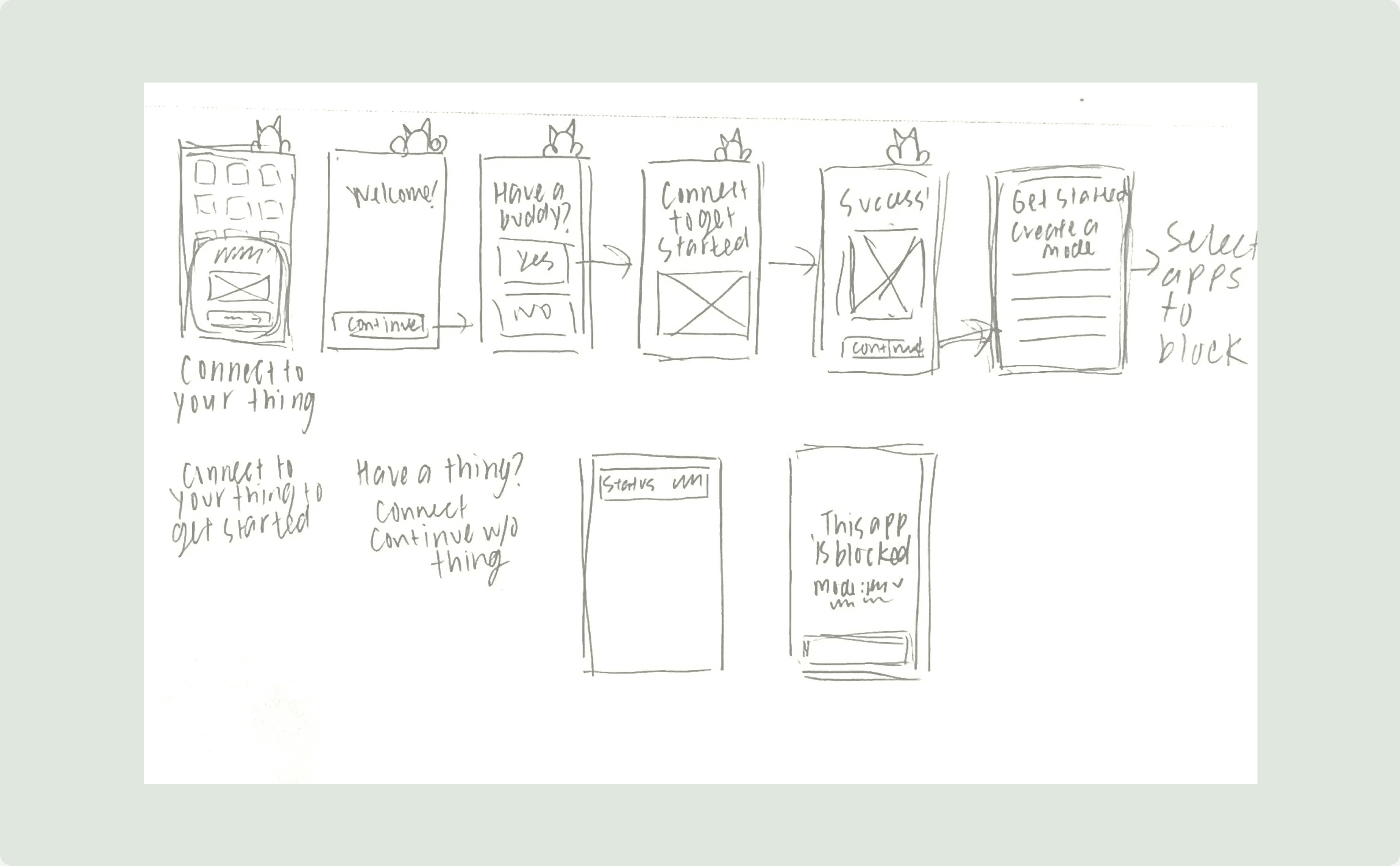 To move fast and validate the core experience, we sketched low-fi wireframes that mapped Sidekick’s most important moments: onboarding, optional accessory setup, Kick creation, and the “blocked app” state. The flow starts by asking whether the user has the physical Sidekick, so the product works with or without hardware, then guides them to set up their first Kick by selecting which apps to block.
