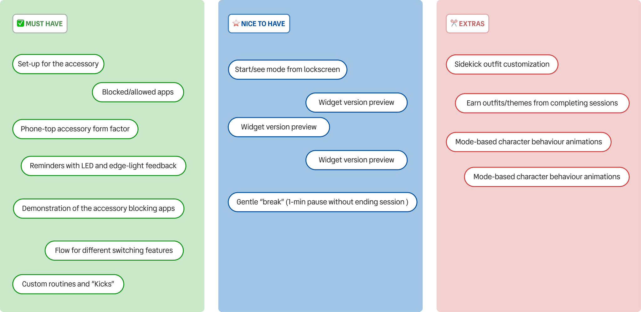 We brainstormed a wide range of feature ideas for Sidekick, then prioritized them into three tiers: Must-haves, Nice-to-haves, and Extras—based on user needs and what we could realistically prototype within the designathon timeline. This helped us stay focused on the core experience while leaving room for additional features if time allowed.