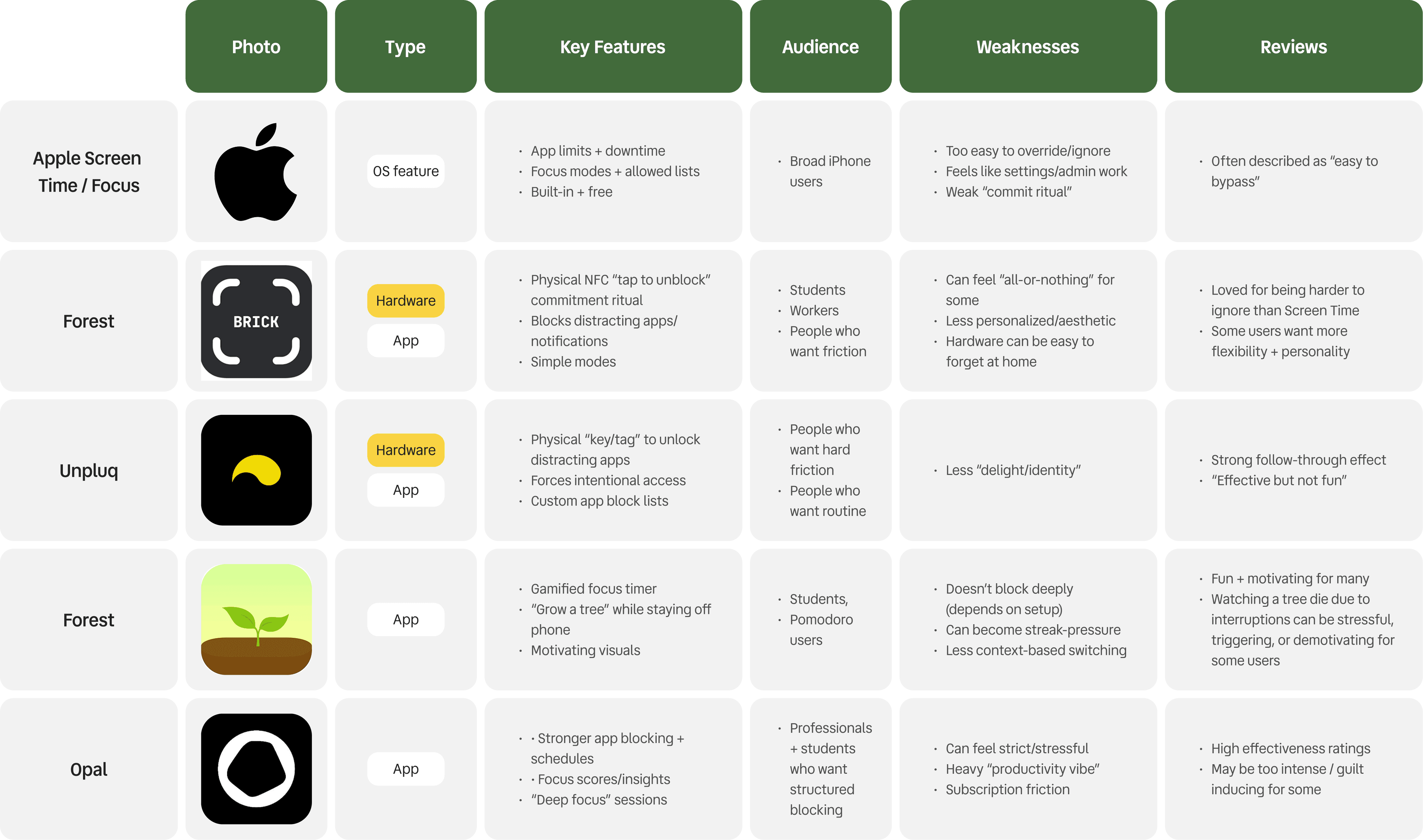 We compared existing tools including digital-only blockers and physical friction hardware to see how well they help people notice time drift and switch states without stress. We found that: